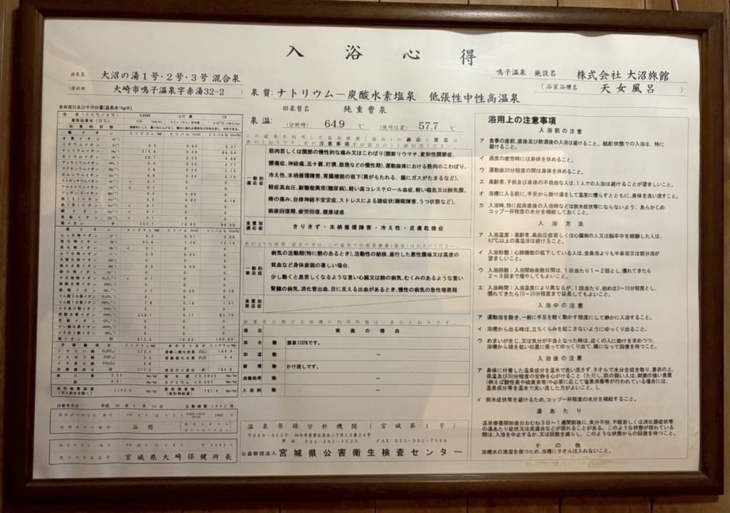 滝の湯は、鳴子温泉神社の御神湯とも呼ばれ、千年の歴史ある白濁したにごり湯の公衆浴場です。丸太の湯口から滝のようにお湯が注がれているのが印象的です。ぬるめと熱めの二種類の浴槽があり、さっぱりとした肌触りでした。滝の湯は酸性泉と含鉄泉という成分が含まれており、体の芯まで温まり、殺菌や肌や体の活性をサポートします。