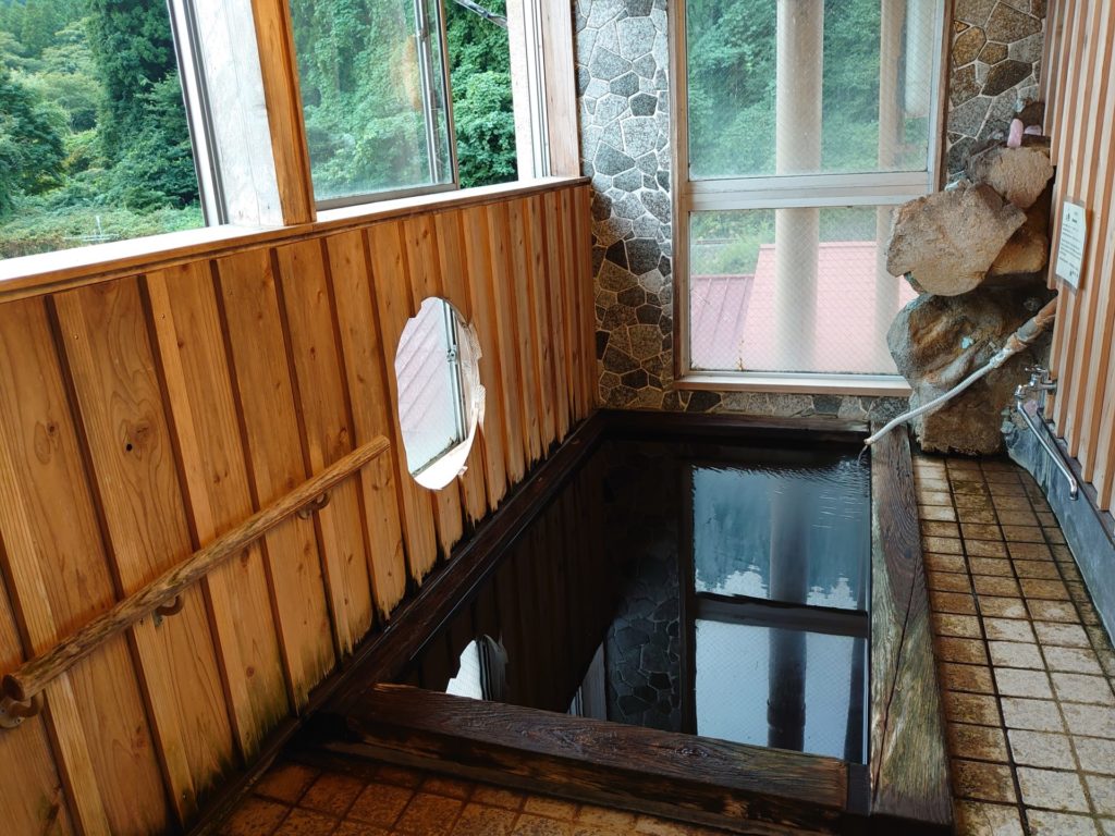 浴場に向かうとふわりと香る硫黄の香り。期待を膨らませて入ると、大きな窓から見える、夏の緑の山々に心を打たれ、絶対に今度ゆっくり来ようと決意しました。。