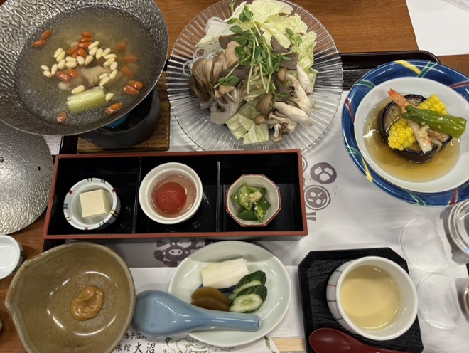 旅館大沼は「現代湯治」を長年提唱していて自分の心身を休めるために訪れるファンが多い宿です。今回は胃腸に負担をかけない1汁5菜のヘルシープランをいただきました。1日目の夜には、旬の野菜を使った自家製薬膳鍋や胡麻豆腐入り茶碗蒸しが出てきました。薬膳鍋に入っていたクコの実と松の実には生活習慣病の予防やエイジングケアなどが期待されています。薬膳鍋に入っている鶏肉以外の肉料理はなかったのですが、どれもとても美味しくて肉がなくてもここまで満足感を得ることができた食事は22年間生活してきて初めての出来事でした!