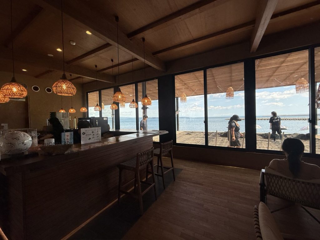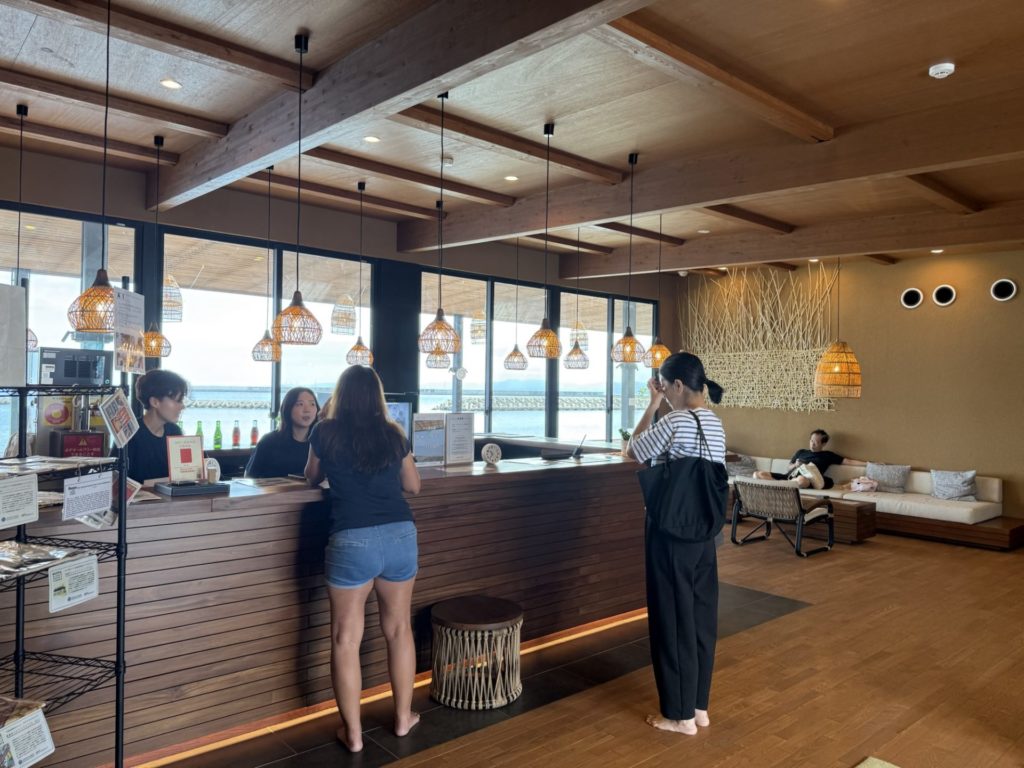 一歩足を中に踏み入れると、海のリゾートに来たような受付と湯上がりバーが。眼前に海が広がっています。