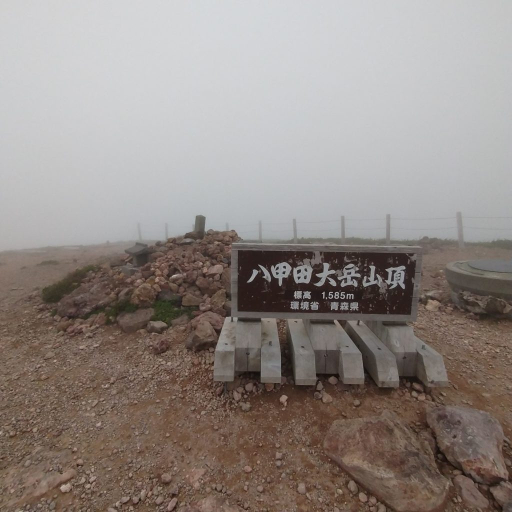 ・・・が、山頂に近づくにつれ、めっちゃ曇ってきた、どころか風が強くなってきた!まっすぐ歩けないくらい。ノースリーブだと寒すぎるので、レインウェア羽織ってしのぐ。何とか山頂!なんも見えん!晴れていれば絶景が広がるはずなんだけど。