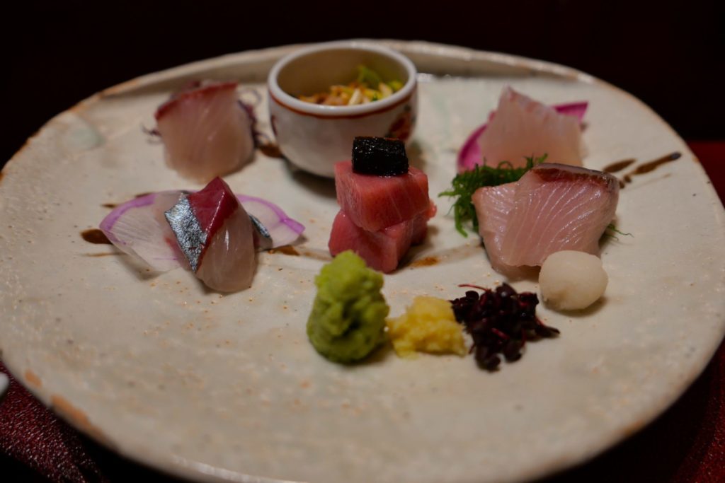 本日のお造りは、マグロ、カンパチ、鯛、ブリ、シマアジ、北寄貝ナムル。土佐醤油、ポン酢、黄身醤油で味わいの変化を楽しみながらいただきます。