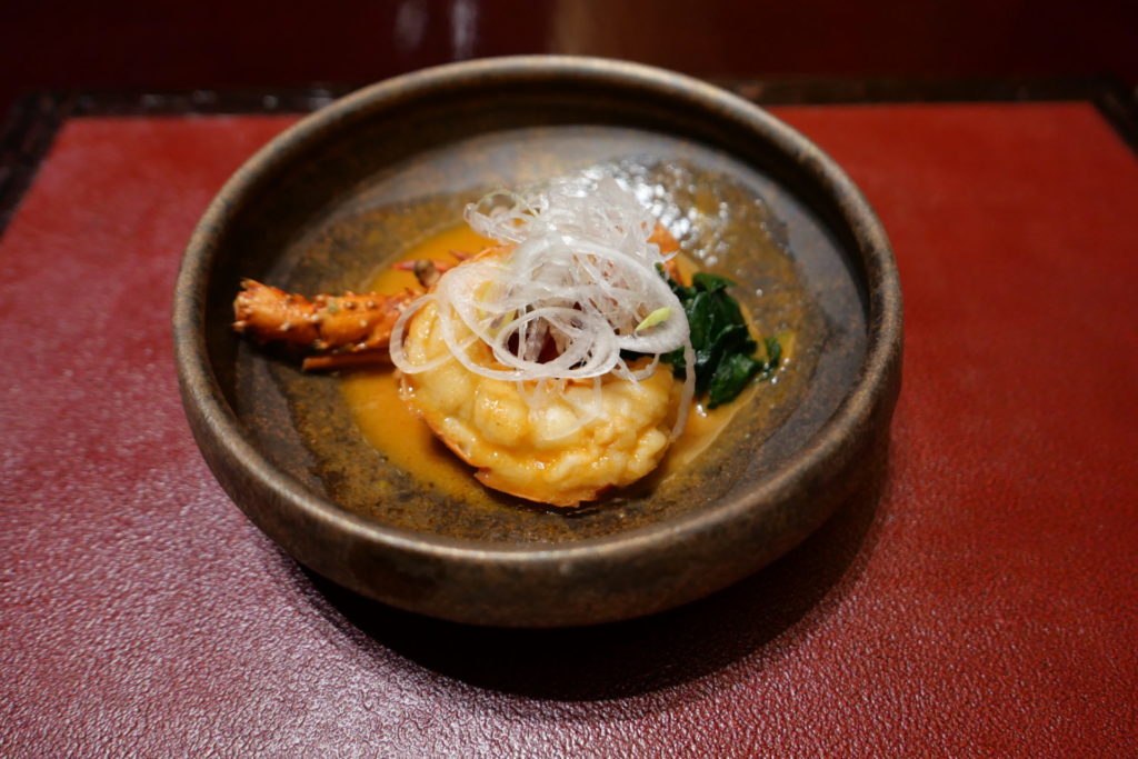 どーんと迫力ある伊勢海老香味具足煮、ブイヤベースのような味わいが美味しい。白髪ねぎが和風のアクセントになって日本酒にもあいそうです。
