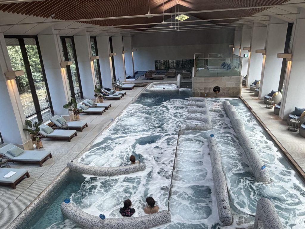 湯船は3段階の深さになっていて、手前は浅くて半身浴、次が座って肩まで浸れる深さ、一番奥は、立って入る深湯になっています。塩分濃度3%は、ほぼ海水と同じくらい、海水浴のように浮力を感じることができます。深湯は横長なので歩行浴をしながら入れば、重力から解放されて浮遊感が味わえ、疲れやコリがほぐれていくように感じます。