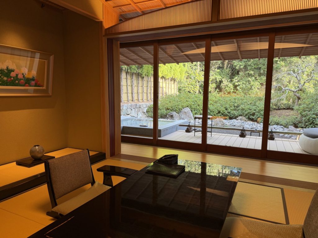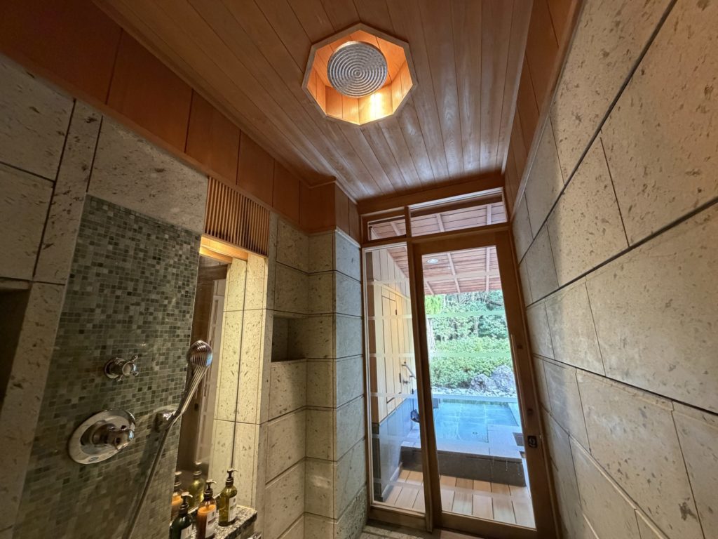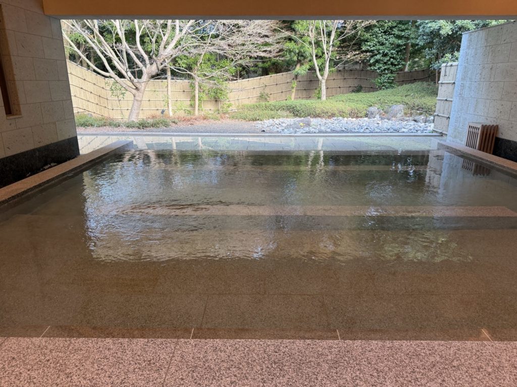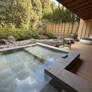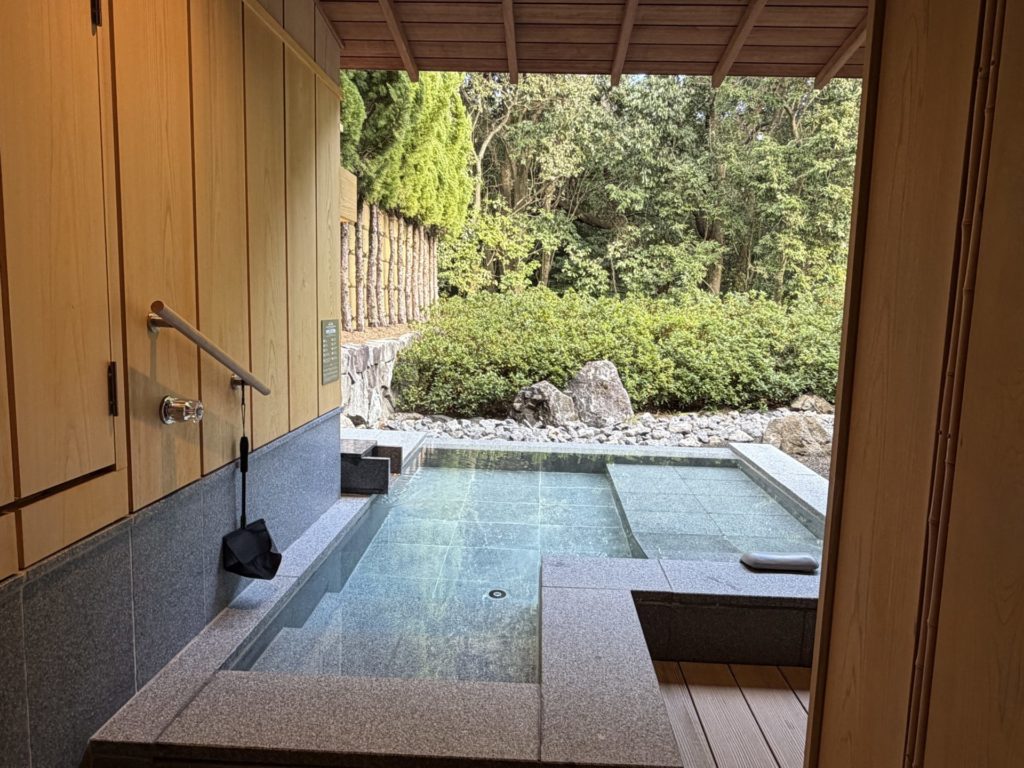 部屋専用の庭園露天風呂は、塩分濃度5%の濃縮海洋深層水を加温した湯です。大浴場や赤沢スパが塩分3%に対して塩分5%!入ってみると、この2%の違いが大違いでした。力を抜くと体がふわふわと浮いてきて、体制を整えるのにコツがいるほど。慣れてくると、このふわふわの浮遊感が脱力できて夢心地。しかしながら、あっという間に体の芯まで温まって発汗してきます。