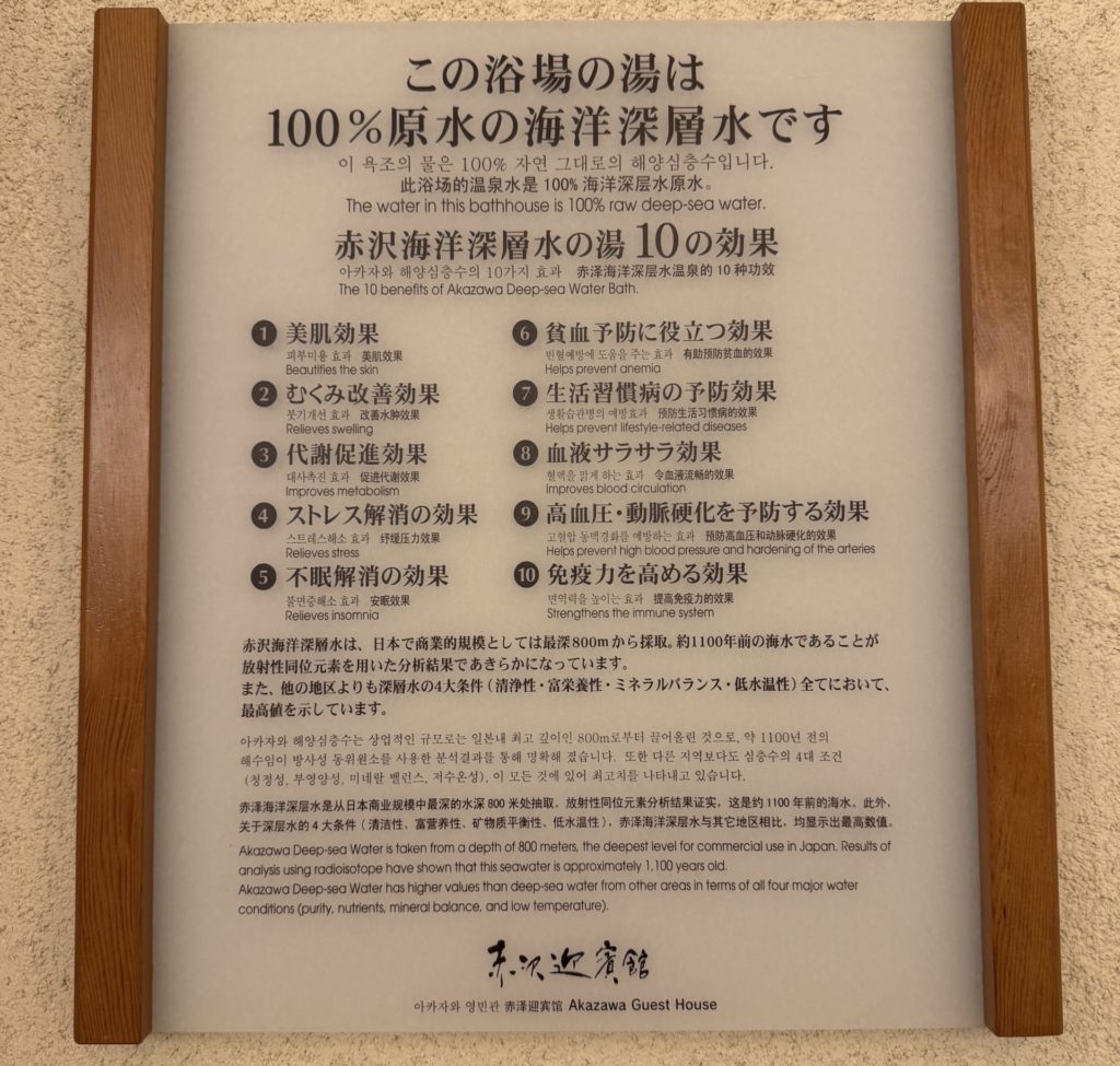 大浴場にも部屋のお風呂にも、こんな看板がかかっていました。美肌、むくみ改善、代謝促進、ストレス解消、不眠解消・・・など、うれしくなる海洋深層水の恩恵。そういえば、濃いめの塩分でたくさん汗をかき、海洋深層水もごくごく飲んで、体の中の水が入れ替わった感じ。夜は爆睡してしまったし、こころなしか、手足がすっきり、肌もつやピカな感じがします。